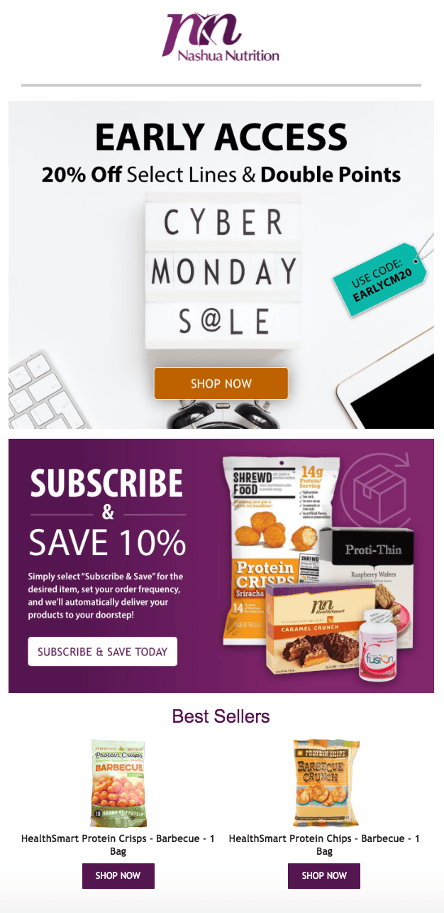To make their existing customers feel special and encourage them to return, health and wellness brand Nasha Nutrition gave their loyal customers early access to their Black Friday deals. They also used their BFCM emails to promote their double point event and as an opportunity to recommend products and upsell their subscription service.