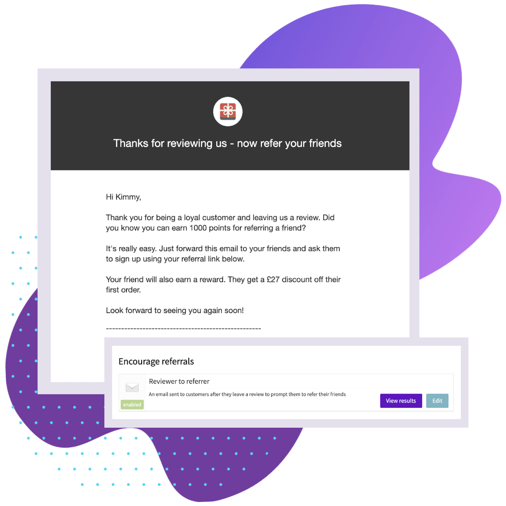 Prompt happy customers who have left reviews to refer their friends and family to your store in your emails. On average, 83% of customers are willing to refer after a positive experience yet only 29% actually do.